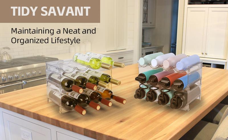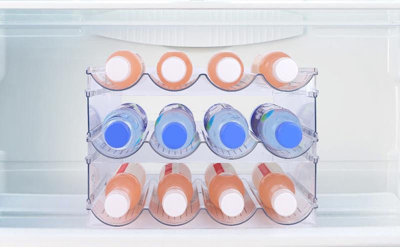 This water bottle organizer can hold 16 bottles per shelf. Stackable design, two to four layers of cup holders can be tightly stacked together to maximize space savings.